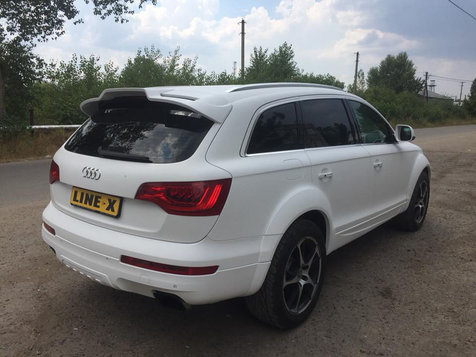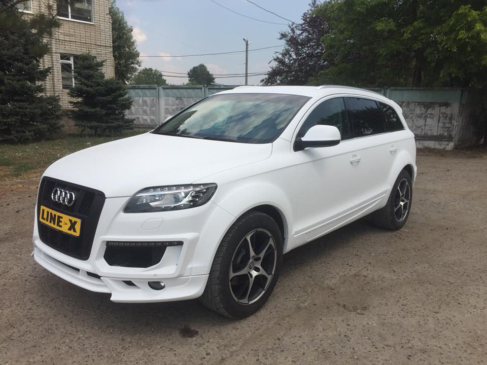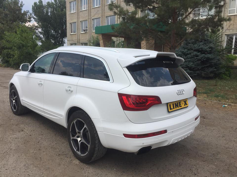 В летнее пекло, садясь в автомобиль, хочется ощутить комфорт приятной прохлады, но чаще всего, оставленная на стоянке под лучами палящего солнца, машина превращается в разогретую «консервную банку». Одним из вариантов решения данного вопроса, является грамотный подбор цвета и материала покраски автомобиля. В данном случае, хозяин Audi Q7 решил задачу на отлично: защитное полимерное покрытие Line-X в сочетании с белой устойчивой к воздействию УФ-излучения краской, нанесенные на кузов автомобиля, способны максимально поддерживать климатический баланс внутри салона. Кроме этого, покрытие Line-X обеспечивает защиту кузова от механических повреждений, коррозии, гидро- и звукоизоляцию.