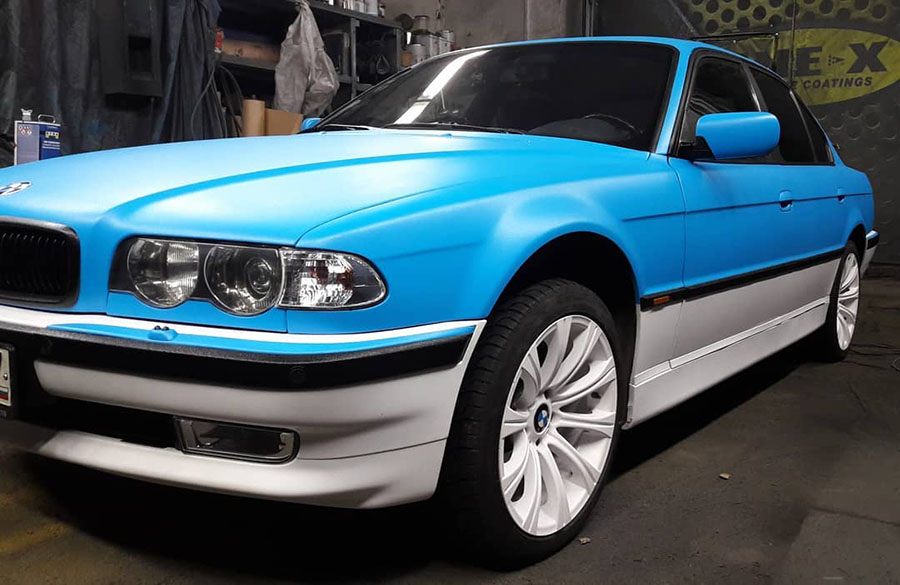 Яркая и красивая работа по окраске кузова представительского седана BMW седьмой серии защитным полимерным покрытием line-X!