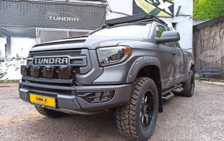 Как любая женщина, любимая машина требует внимания и заботы, за ней надо постоянно следить, покупать дорогие подарки и тогда, она будет радовать красивым внешним видом и безотказной работой. Хозяин этой Тайоты Тундры явно не экономил на своей машине, тут и куча «украшений» в виде обвеса (силовые бампера, защитные арки, экспедиционный багажник) и модельная обувка и подводка глаз в виде дополнительной оптики, ну и конечно полный набор «мейкапа» состоящего из защитного покрытия Line-X и аэрографии. Фото: Line-X MSK