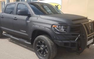 Очередная Toyota Tundra была перекрашена из черного в черный в тюнинг ателье «Армлайн», с одной немаловажной деталью: покраска производилась не обычным ЛКП, а с использованием защитного полимерного покрытия Line-X. Такое покрытие обладает крайней устойчивостью к механическим повреждениям, что позволяет защитить кузов от ударов, царапин и коррозии на весь срок службы автомобиля.
