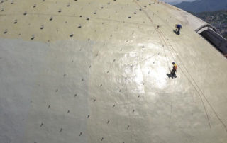 Наглядная иллюстрация процесса применения полимерного покрытия Line-X, для защиты и гидроизоляции зданий со сложной конструкцией кровли. Лайнексом было обработано более 7 000 м2 крыши концертного зала в Монтеррее. Фото: Line-X Culiacán