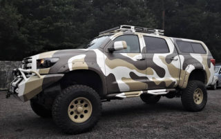 В результате тюнинга в техническом центре 4х4 Tundra, получился автомобиль, у которого все мега: высоченный 9" лифт подвески, большие 37мые колеса, огромный силовой обвес и здоровенный кузов, покрытый прочнейшим защитным покрытием Line-X.