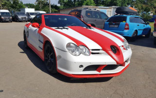 Встречайте: Mercedes SLR защищенный полимерным покрытием Line-X. Стремительные обводы кузова родстера, теперь подчеркивают контрастные красно-белые полосы, а убирающаяся пластиковая крыша и задний спойлер окрашены в черный цвет.