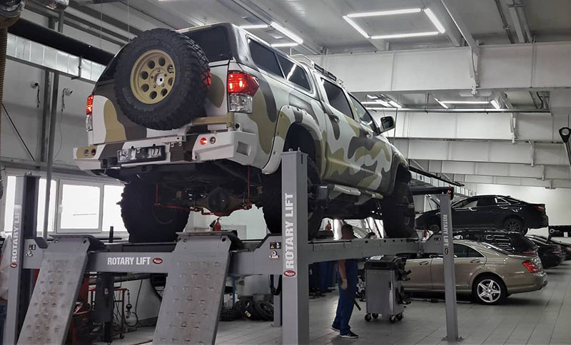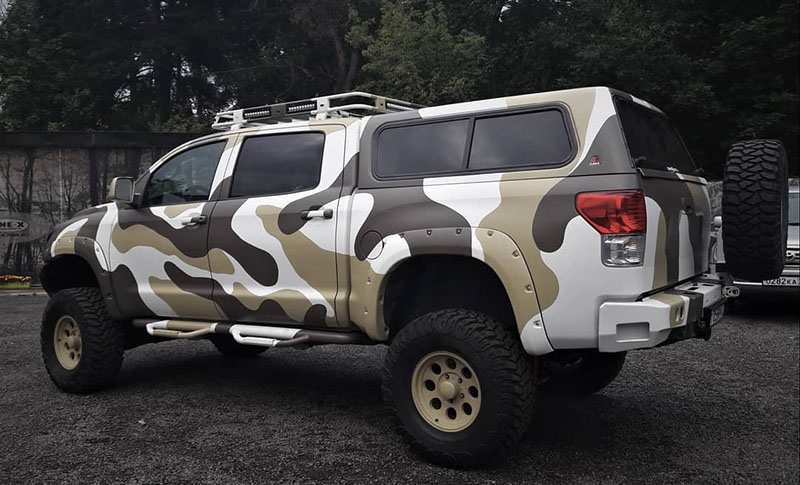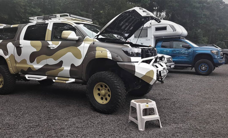 В результате тюнинга в техническом центре 4х4 Tundra, получился автомобиль, у которого все мега: высоченный 9″ лифт подвески, большие 37мые колеса, огромный силовой обвес и здоровенный кузов, покрытый прочнейшим защитным покрытием Line-X.