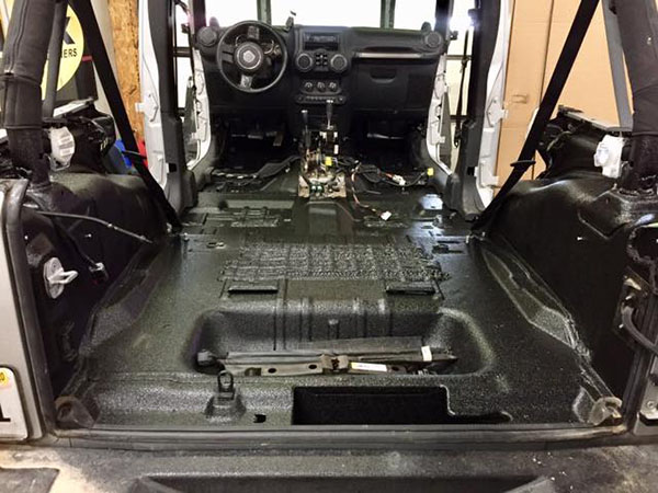 На пол салона Джипа нанесли слой защитного покрытия Line-X. Таким образом удалось добиться 100% гидроизоляции сохранив в рабочем состоянии все технологические отверстия, избавиться от избыточной влажности и неприятного запаха в салоне, а кузов автомобиля надежно защитить от возможной коррозии. Фото: Line-X Decatur Customs