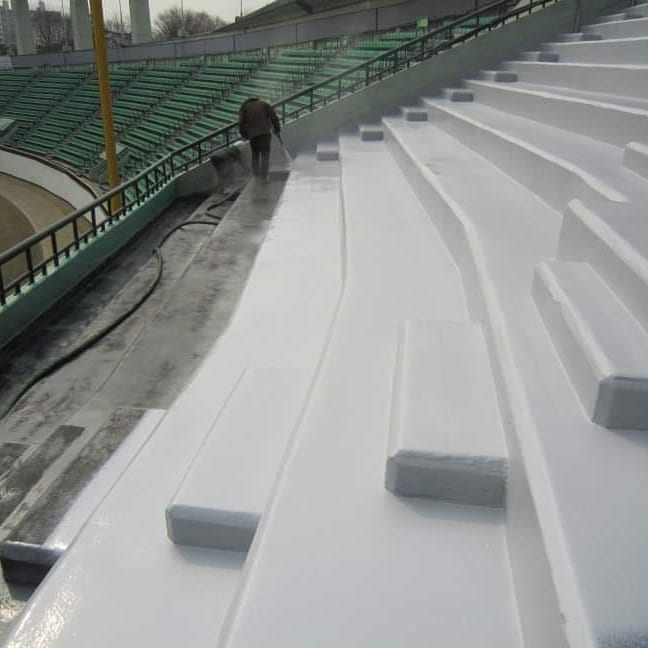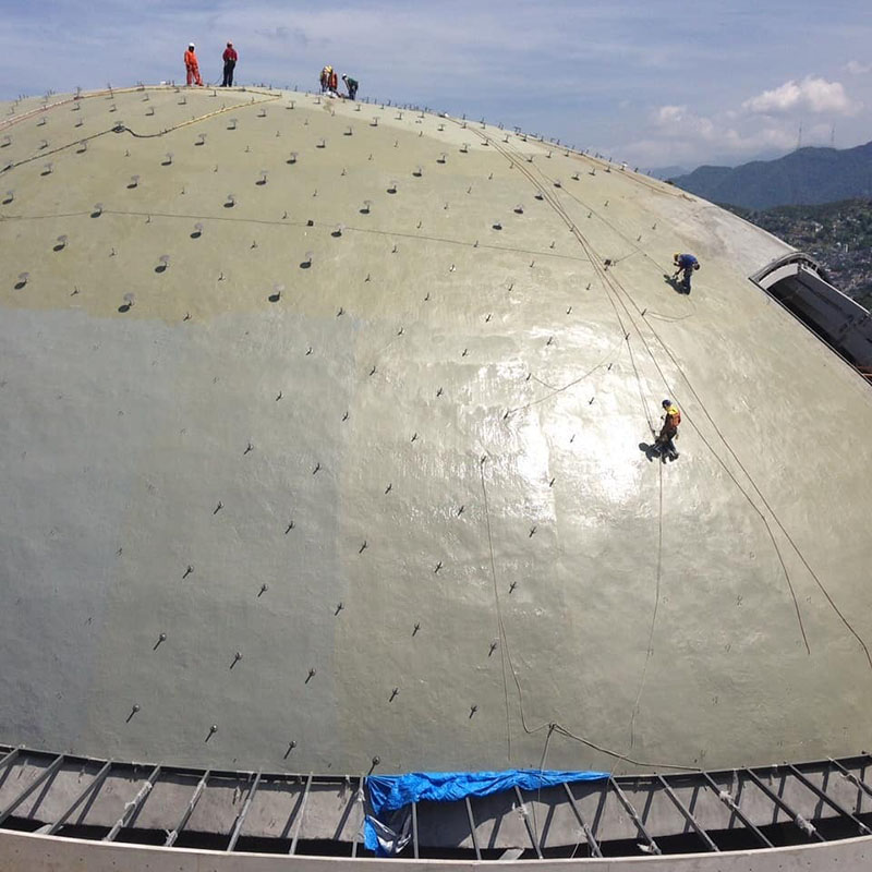 Наглядная иллюстрация процесса применения полимерного покрытия Line-X, для защиты и гидроизоляции зданий со сложной конструкцией кровли. Лайнексом было обработано более 7 000 м2 крыши концертного зала в Монтеррее. Фото: Line-X Culiacán