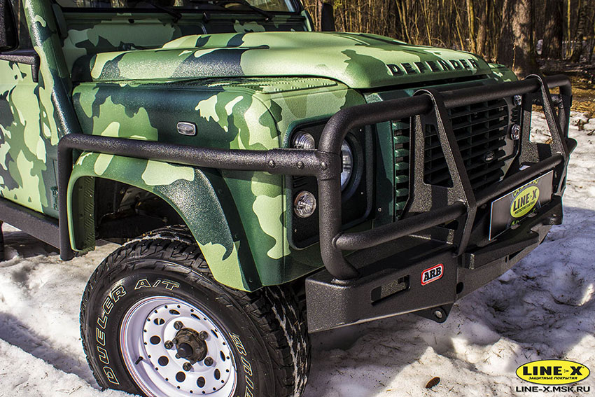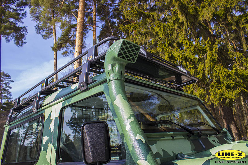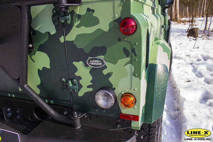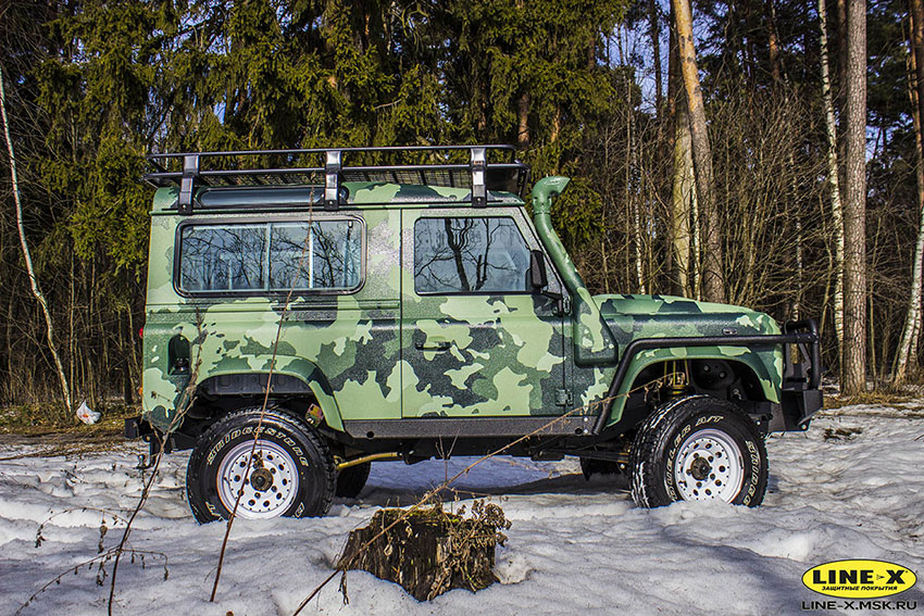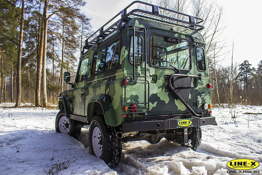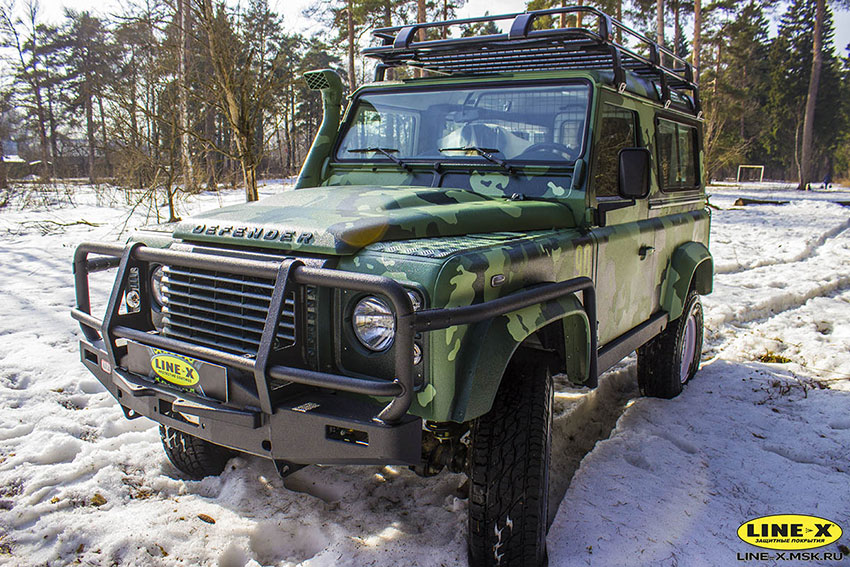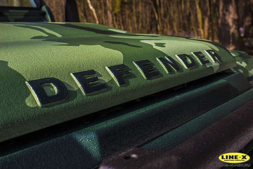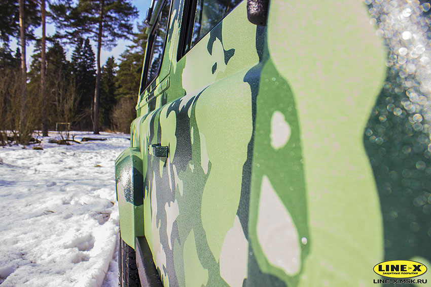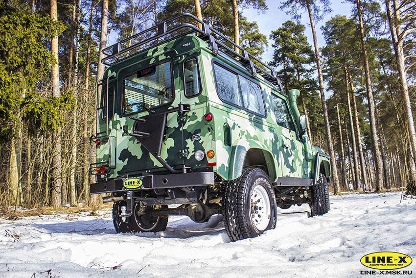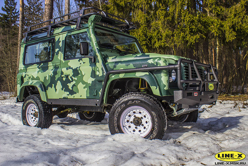 Очередная совместная работа тюнинговой компании Line-X MSK и художника-аэрографа Елены Неклюдовой. Для защиты от механических повреждений и коррозии, кузов полноприводного внедорожника Land Rover Defender обработан полимерным покрытием Line-X, а затем, разрисован в маскировочный окрас. Дополнительно на автомобиль установили силовой обвес, шноркель, защиту картера, экспедиционный багажник на крышу и крепление для запасного колеса на заднюю дверь. После проведенных работ Land Rover «Защитник» стал еще более защищенный от случайных сколов и царапин и приобрел новый неповторимый внешний вид!