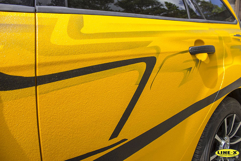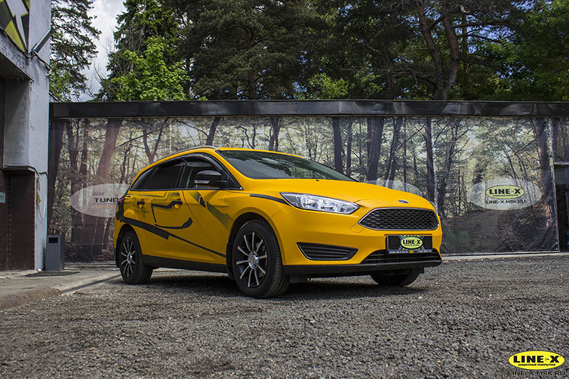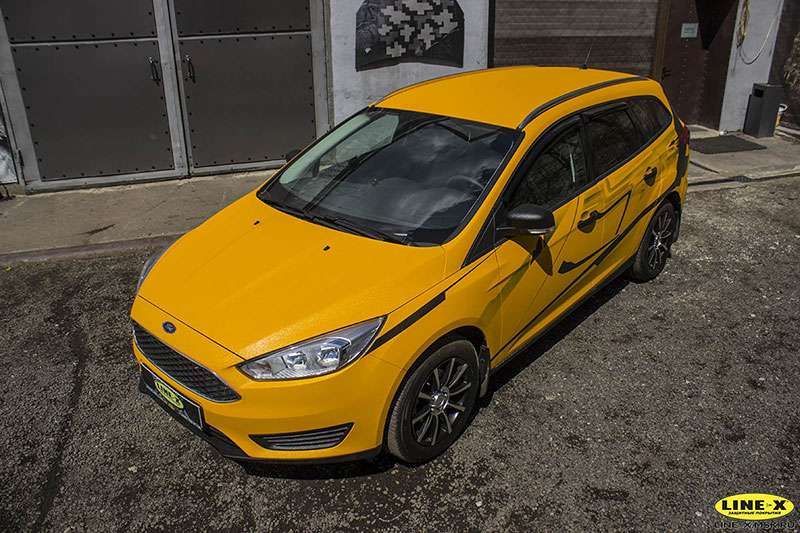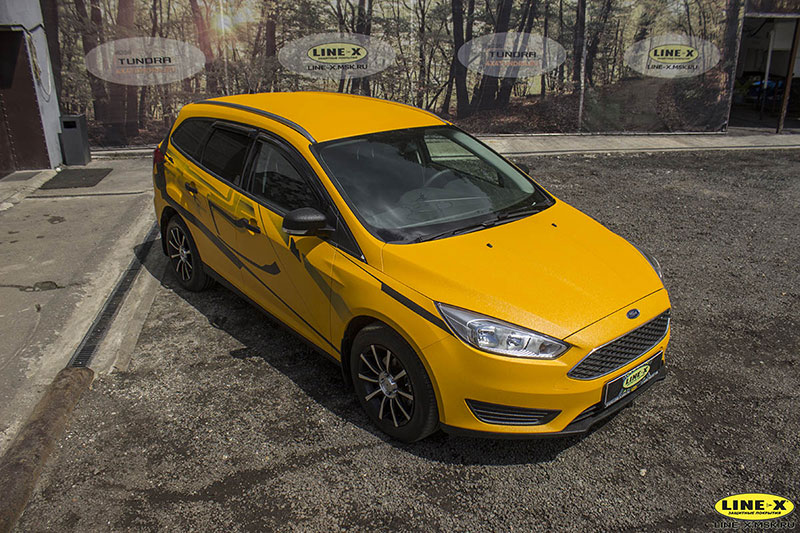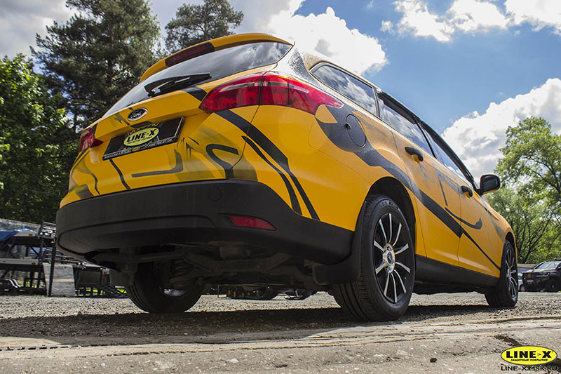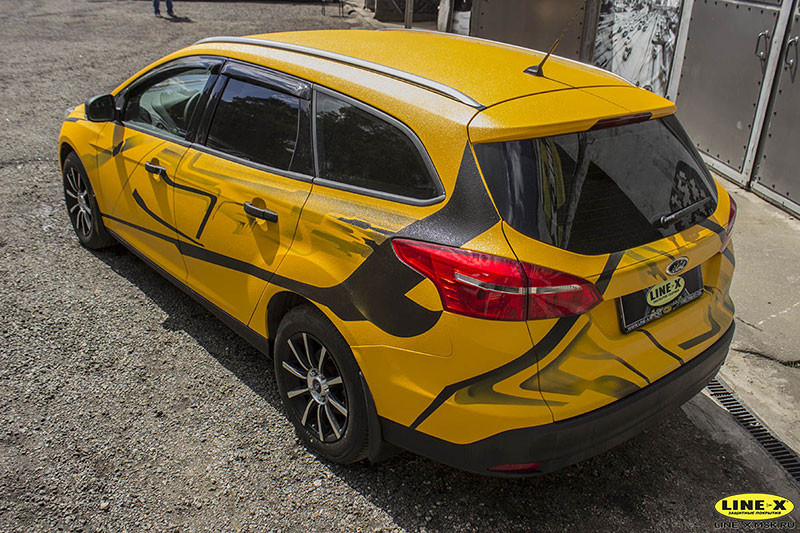 На сегодняшний день, наиболее эффективным средством защиты кузова городского автомобиля от механических повреждений и коррозии является полимерное покрытие Line-X. Покрытие Line-X надежно противостоит сколам и царапинам и даже не сильным ударам при столкновении автомобилей, которые, к сожалению, весьма часто случаются в дорожных пробках. Еще Line-X отличный способ выделится из общего потока, придав своему автомобилю яркий, неповторимый внешний вид, как это сделал клиент компании Line-X MSK, окрасив свой Ford Focus универсал в насыщенный желтый цвет, с ассиметричными черными полосами. Получилось очень красиво и самое главное – крайне заметно, Focus сразу «бросается в глаза», ведь в природе такая окраска присуща опасным ядовитым насекомым.