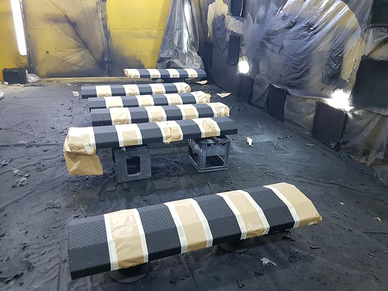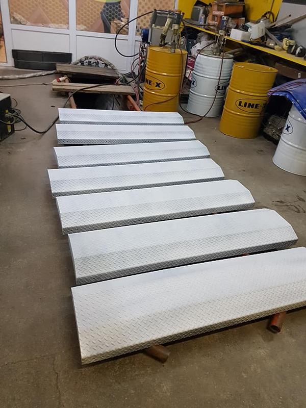 Ставим эксперимент по защите металлических искусственных неровностей (лежачих полицейских) для ограничения скорости движения на новых бетонных трассах. Зачищаем, грунтуем, наносим на внешнюю сторону лежачего полицейского слой полимерного покрытия Line-X, которое должно защитить его от механического износа, ржавления и сохранить сигнальную раскраску.