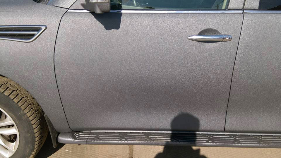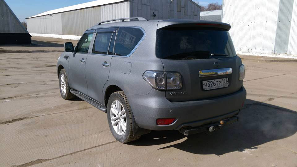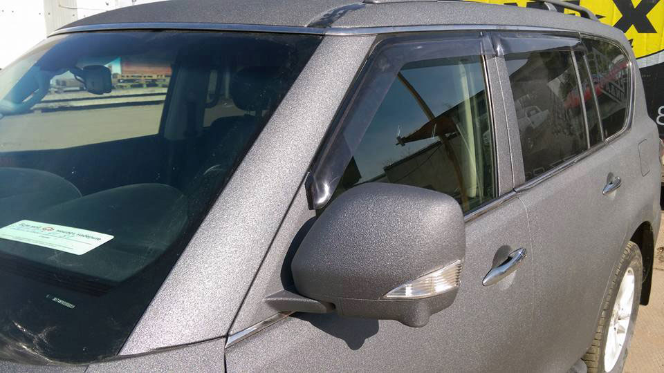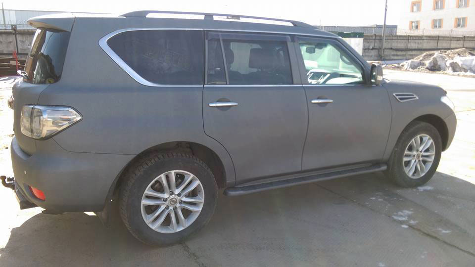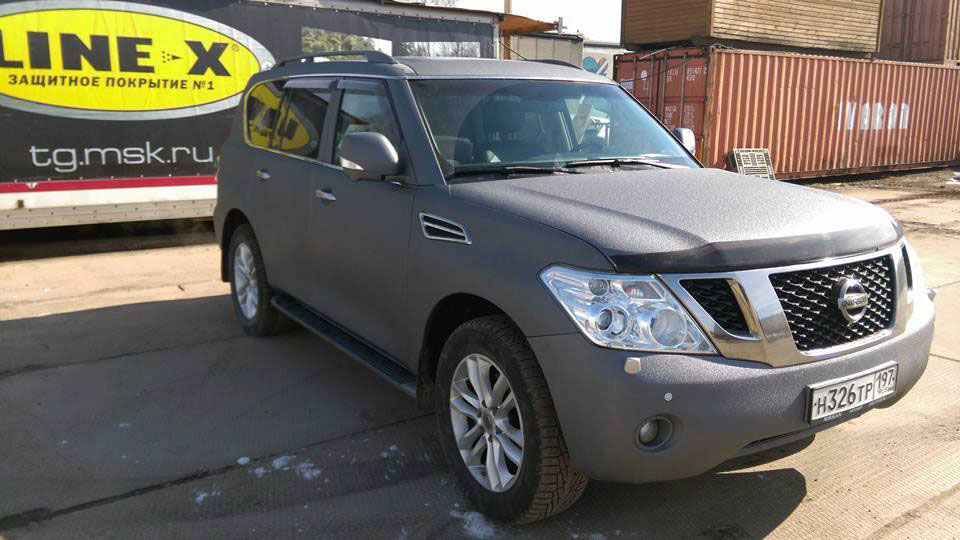 В лучах угасающего солнца полноразмерный внедорожник Nissan Patrol выставляет напоказ свои свежевыкрашенные защитным полимерным покрытием Line-X бока.