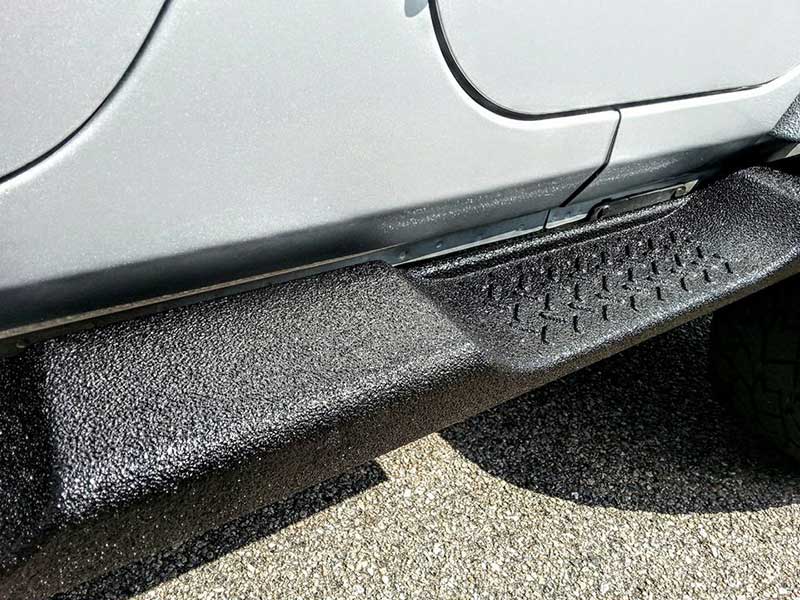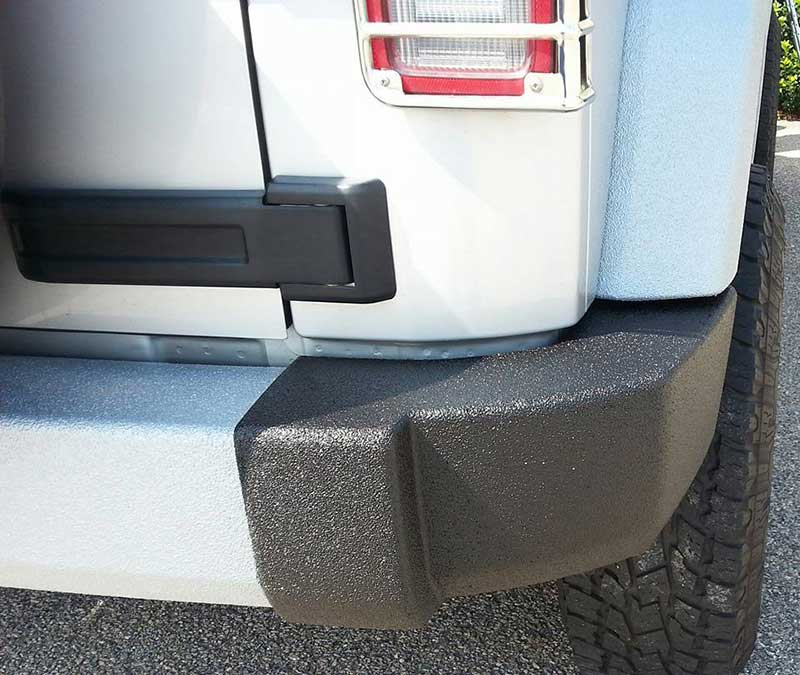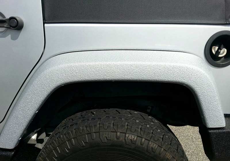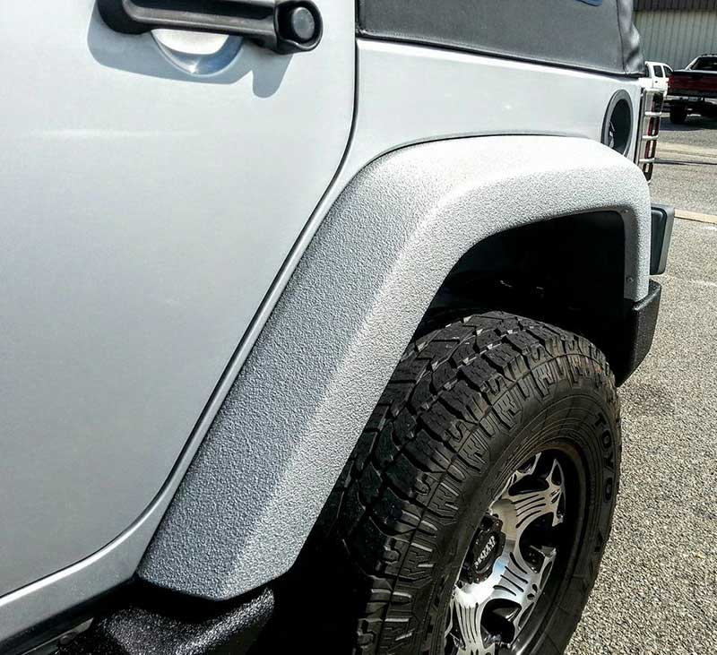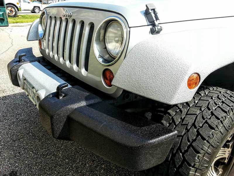 По просьбе клиента, было использовано два финишных цвета в процессе обработки аксессуаров внедорожника Wrangler 2008 года защитным покрытием Line-X. Накладки арок колес автомобиля окрасили под цвет кузова — в серебряный, силовые пороги – в черный, а при покраске бамперов просочитали оба эти цвета.