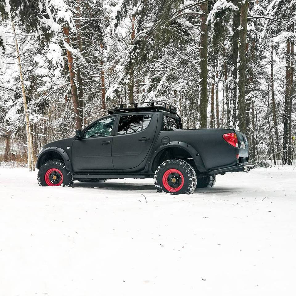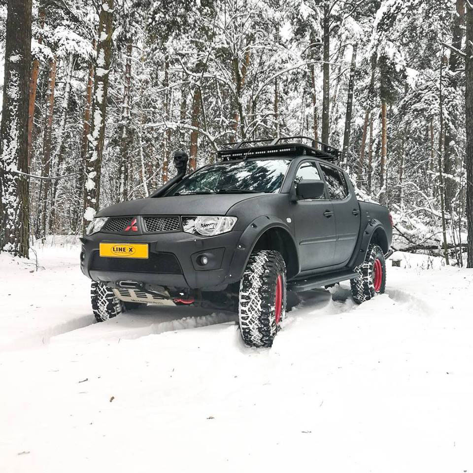 Великолепные фотографии Mitsubishi L200 в черном полимерном покрытии Line-X на фоне белоснежных сугробов в зимнем лесу.