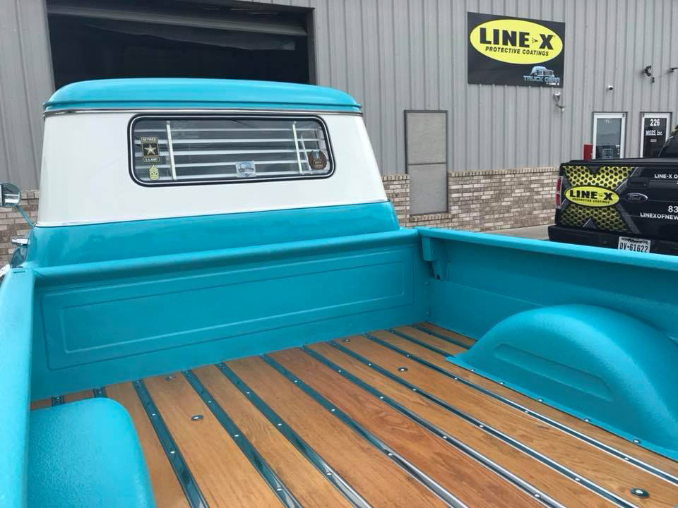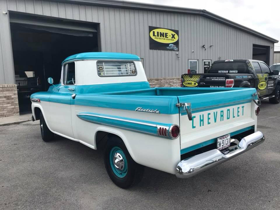 Благодаря стараниям ребят из Line-X of New Braunfels, классический пикап Шевроле был полностью восстановлен и приобрел неповторимый яркий летний вид. В процессе ремонта были использованы как старые аутентичные детали, так и новейшие технологии полимерной защиты, в частности борта грузового отсека кузова пикапа, был окрашен защитным покрытием Line-X.