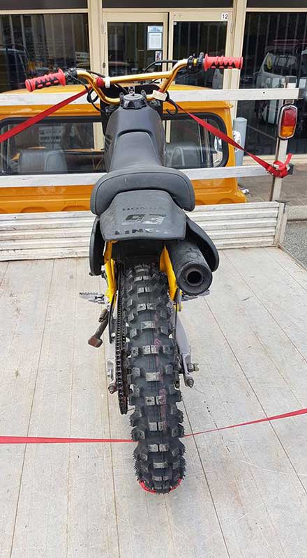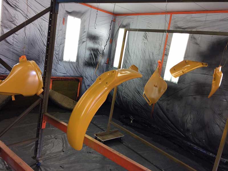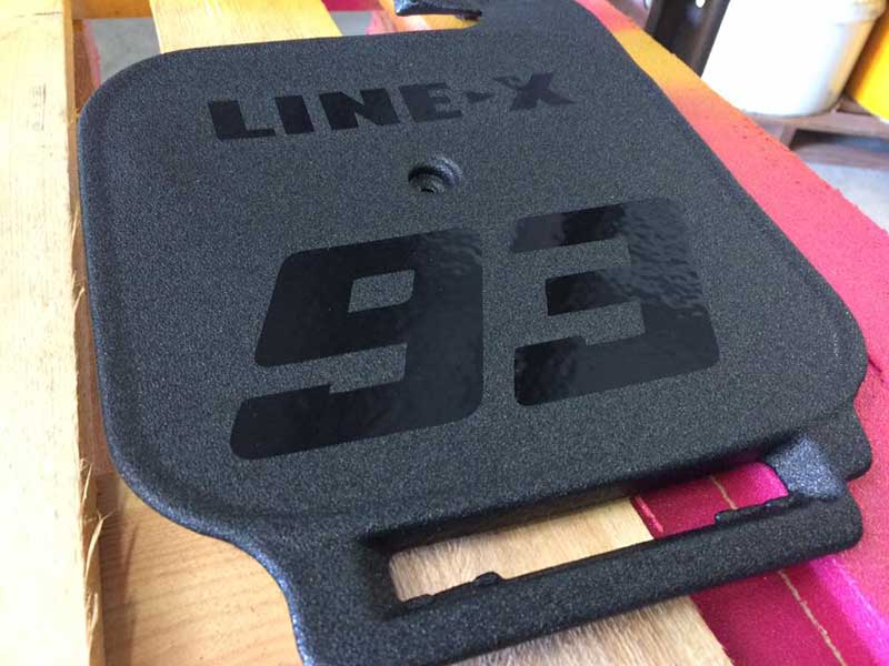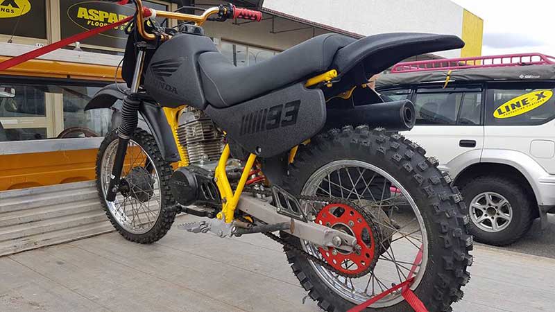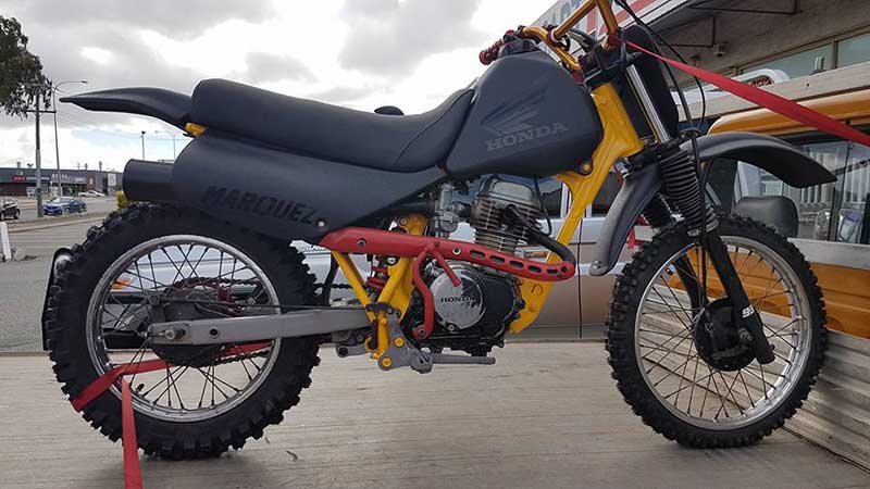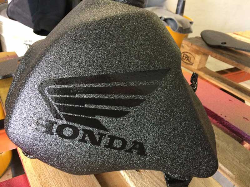 Для защиты от ударов и царапин аксессуары (крылья, накладки) и бензобак кроссового мотоцикла окрасили защитным полимерным покрытием Line-X черного цвета. С помощью трафарета нанесли логотип Honda, порядковый номер и фамилию молодого гонщика.