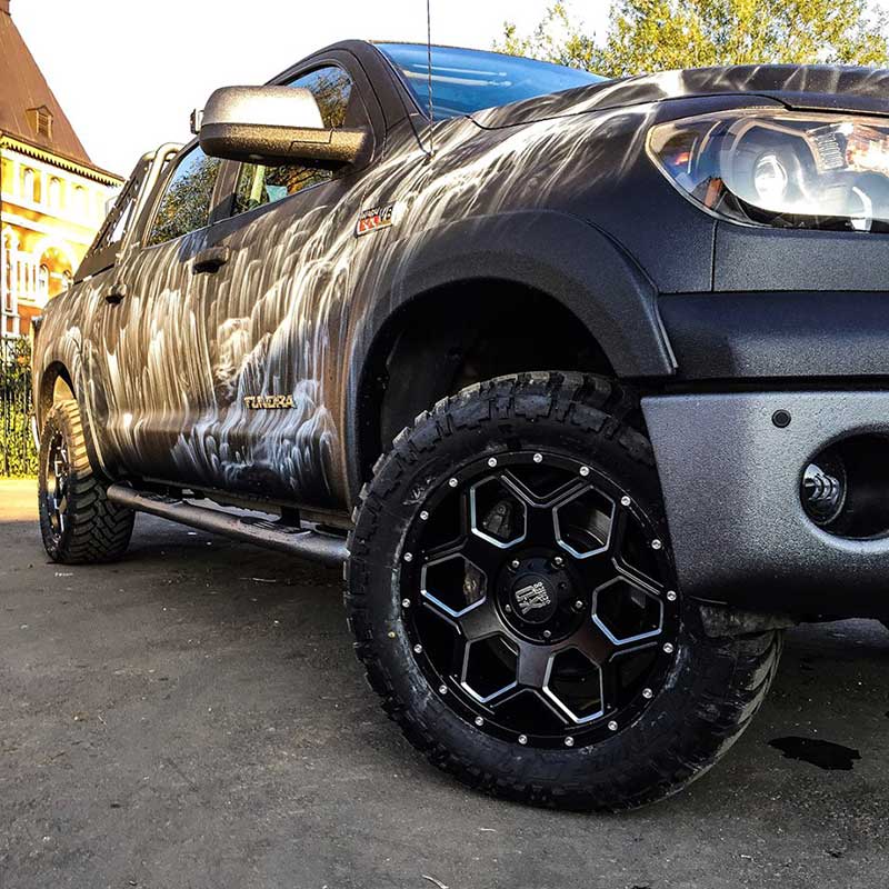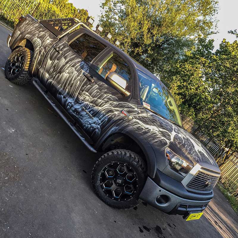 Полная защита кузова внедорожного пикапа Toyota Tundra полимерным покрытием Line-X с аэрографическим рисунком.
