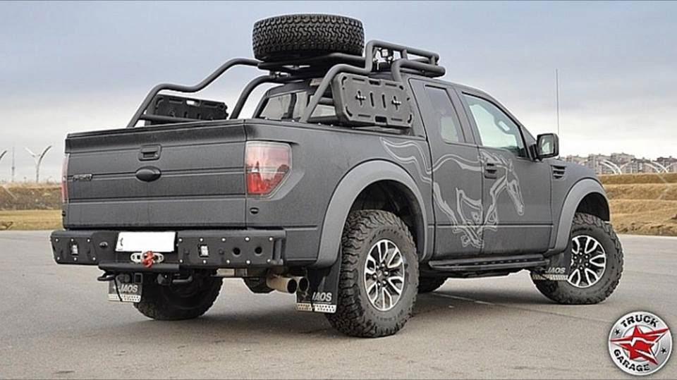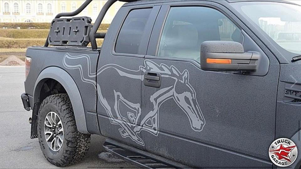 Благодаря стараниям сотрудников тюнинг-ателье Truck Garage полноприводный пикап Ford Raptor превратился в технологически выверенного «Жеребца». На машину была установлена усиленная подвеска King, две лебедки, панели дополнительного света, силовые бампера и трубчатая конструкция для крепления запасного колеса, место под днищем, высвободившееся при переноски запаски на крышу, занял дополнительный топливный бак с автоматизированной системой перекачки топлива в основной. Последним штрихом перерождения автомобиля стала задувка всего кузова и навесных элементов защитным полимерным покрытием Line-X, поверх которого нанесли силуэт стремительно скачущего мустанга!