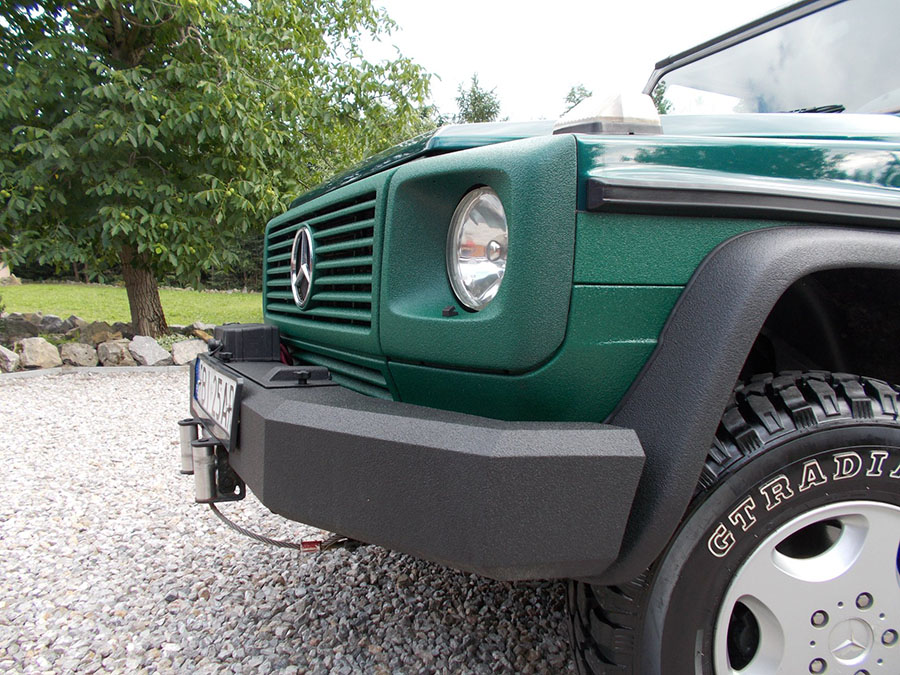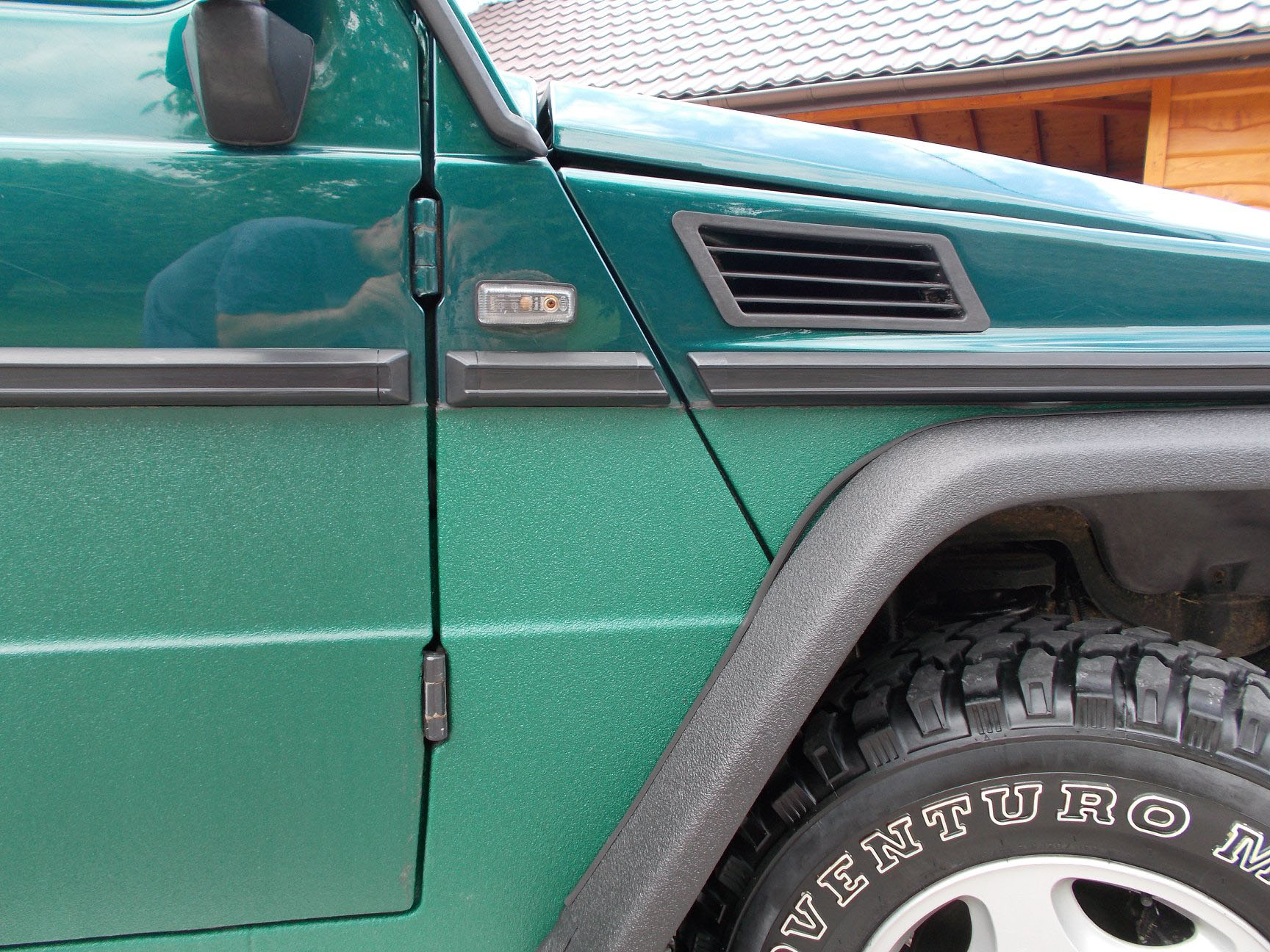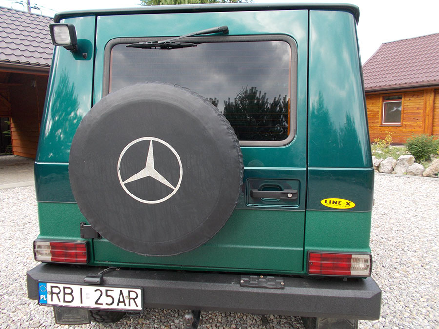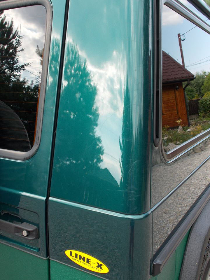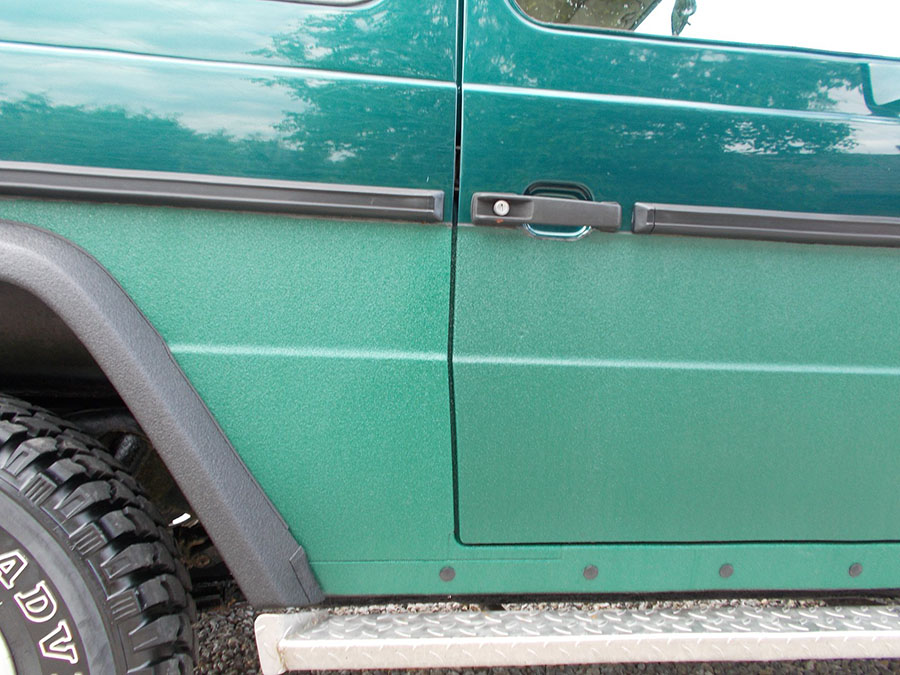 Ровно на половине кузова остановились специалисты компании LINE-X UK при окраске кузова внедорожника Mercedes-Benz Geländewagen защитным покрытием Line-X, либо закончились материалы, либо заказчик посчитал, что и так достаточно! И зря. Если внимательно присмотреться, то на фотографиях видно следы царапин от веток на не защищенной Line-X поверхности, которые остались после последней поездки на «Гелике» по лесу.