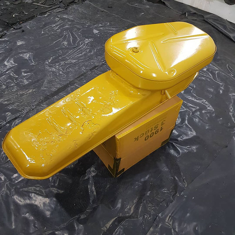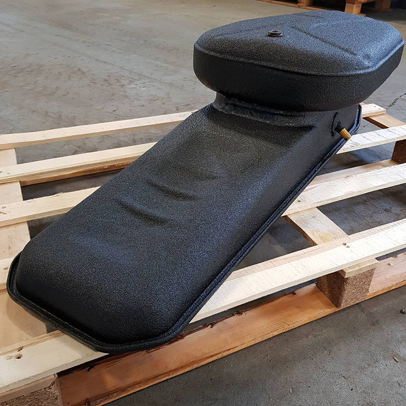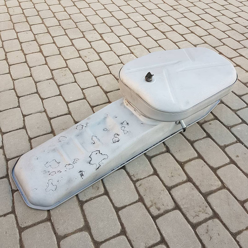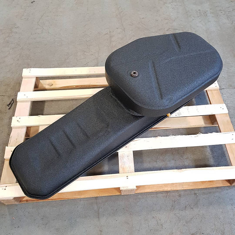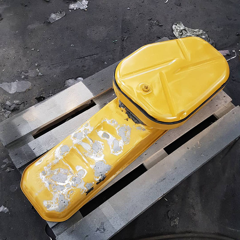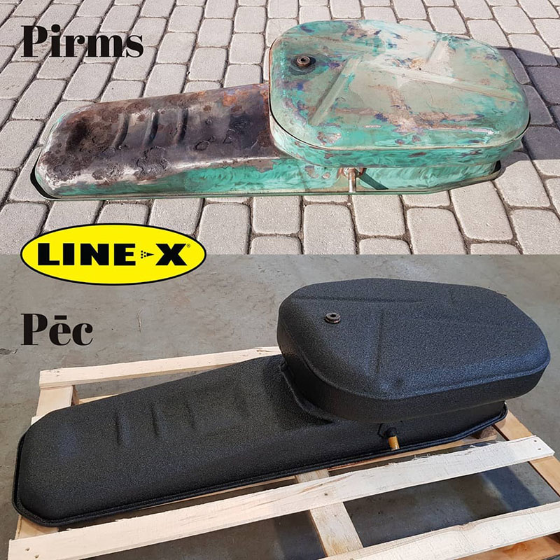 Покрытие Line-X подходит для защиты как всего автомобиля целиком, так и его отдельных элементов. К примеру, этот старый ржавый масляный картер отремонтировали и окрасили защитным покрытием Line-X, для защиты от механических повреждений и коррозии в любых условиях, где бы не эксплуатировался грузовик Volvo FH 12.