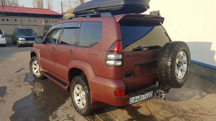 С точки зрения защиты, это наиболее полный пакет, покрытием Line-X был обработан весь кузов внедорожника, пороги, бампера, зеркала заднего вида, стойка и сам навесной багажник и даже труба воздухозаборника. Теперь Тойоте Прадо не страшны царапины, сколы и можно забыть о проблеме коррозии кузова.