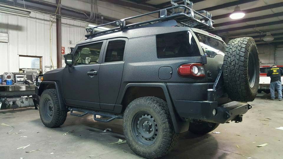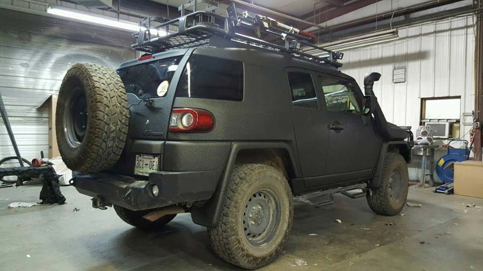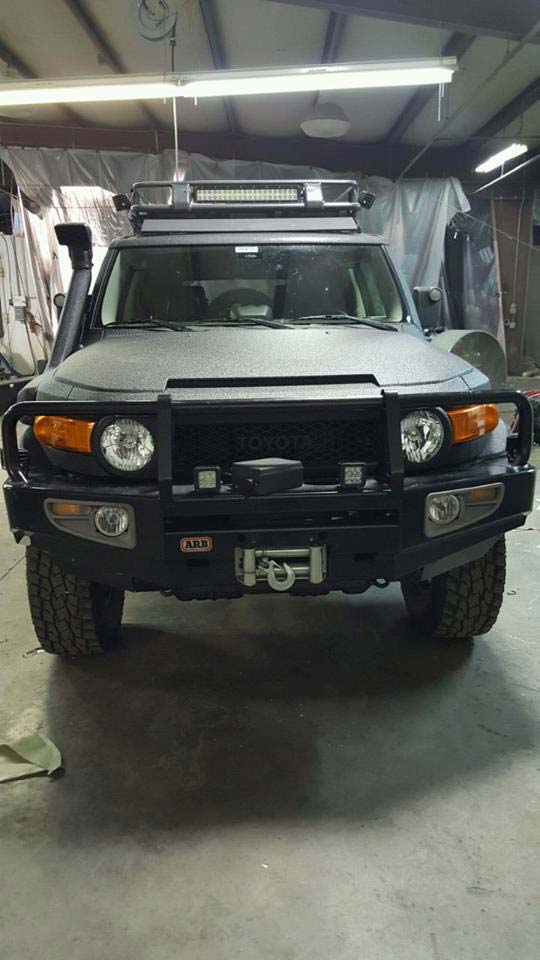 Подготовка полноприводного внедорожника Toyota FJ Cruiser к соревнованиям по джиппингу. Среди установленного стандартного набора любителя езды по бездорожью: лифтинг, защита двигателя, шноркель, экспедиционный багажник, силовой обвес, лебедка, дополнительный свет, отдельно выделяется защита кузова автомобиля полимерным покрытием Line-X.