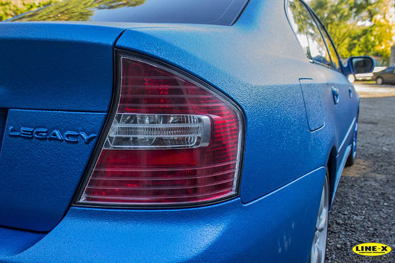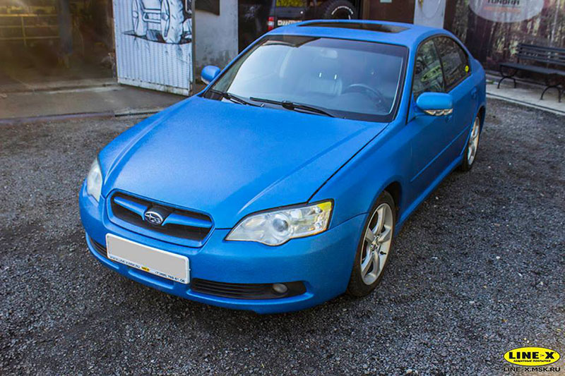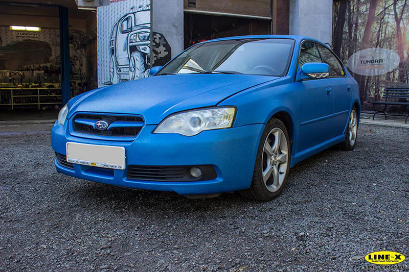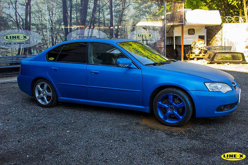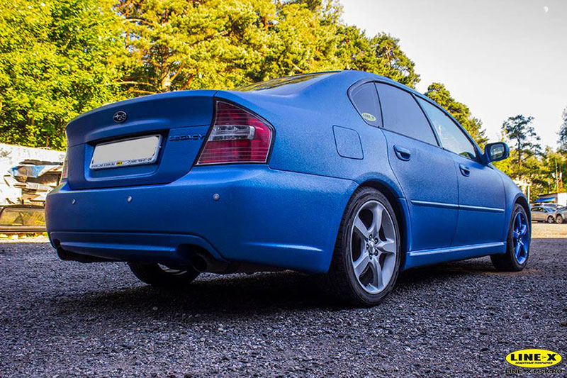 Именно эти три характеристики наиболее полно описывают нашего сегодняшнего героя. Представляем Вашему вниманию седан повышенной проходимости Subaru Legacy окрашенный защитным полимерным покрытием Line-X синего цвета.
